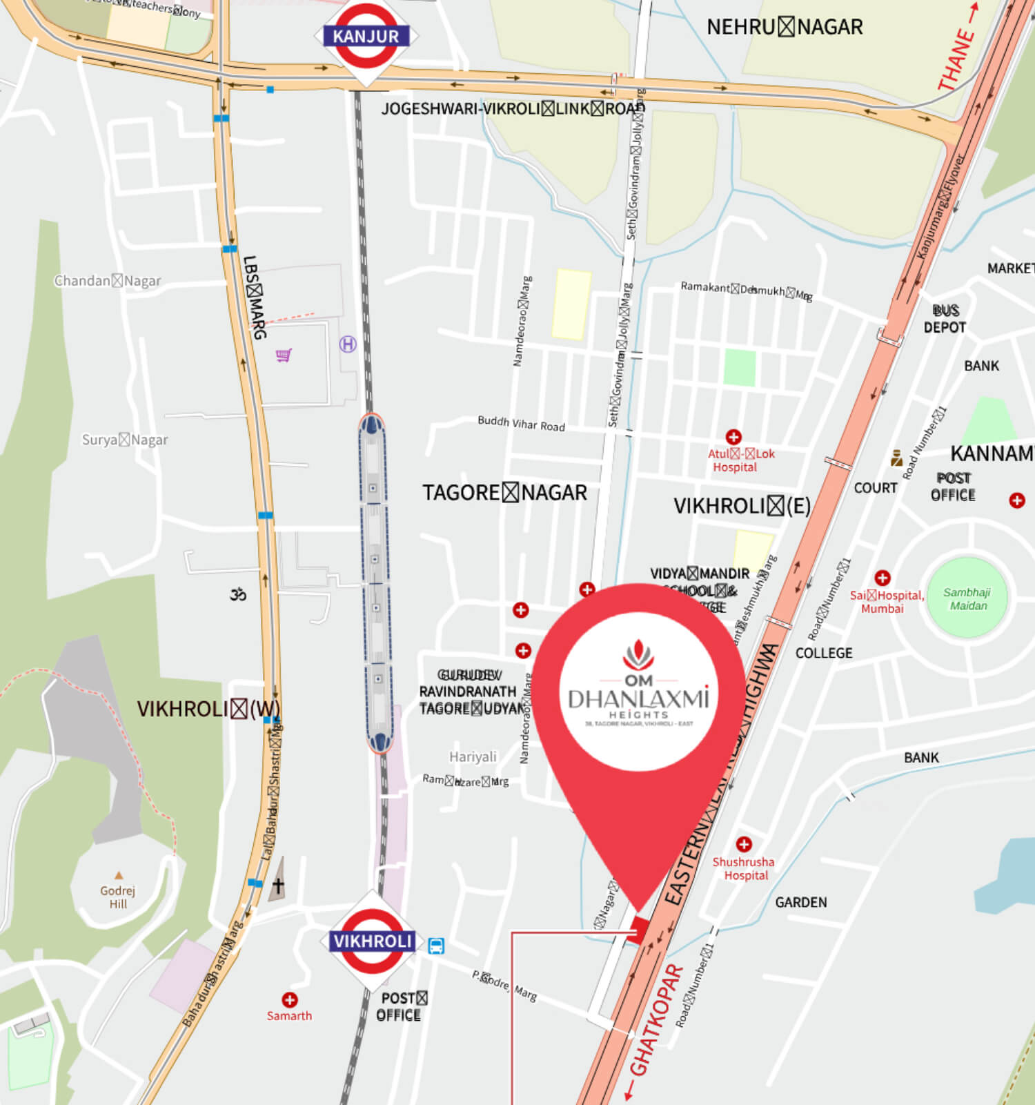 — Primarily located on a 15 meter wide Tagore Nagar Road, off Eastern Express Highway